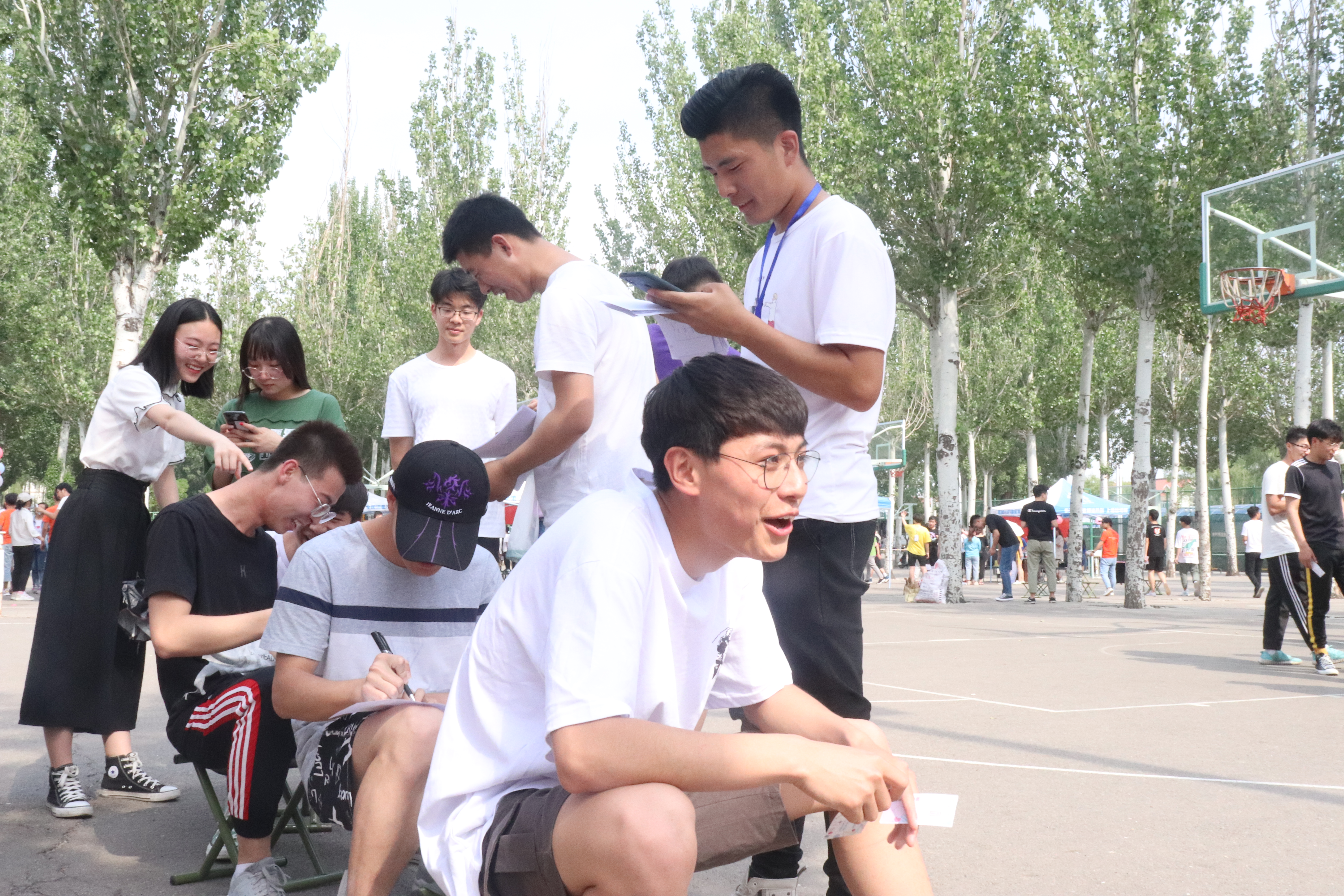 烈日炎炎,三十度的高温也阻挡不了同学们参与的热情。超级大头贴考验的是两人小团体的默契及反应能力,30秒提问时间,要悉知自己头顶词语的关键信息,参加游戏的同学互帮互助,得出答案的那一刻,一切烦恼烟消云散。你画我猜考验的是多人之间的默契,在这个游戏中,同学们化身灵魂画家,被同化成猫的斑马,一团乱麻的蜘蛛侠,长方形组成的变形金刚……同学们欢声笑语吸引了老师的目光,师生一起合作游戏,最后有的同学将作品拍照留念。